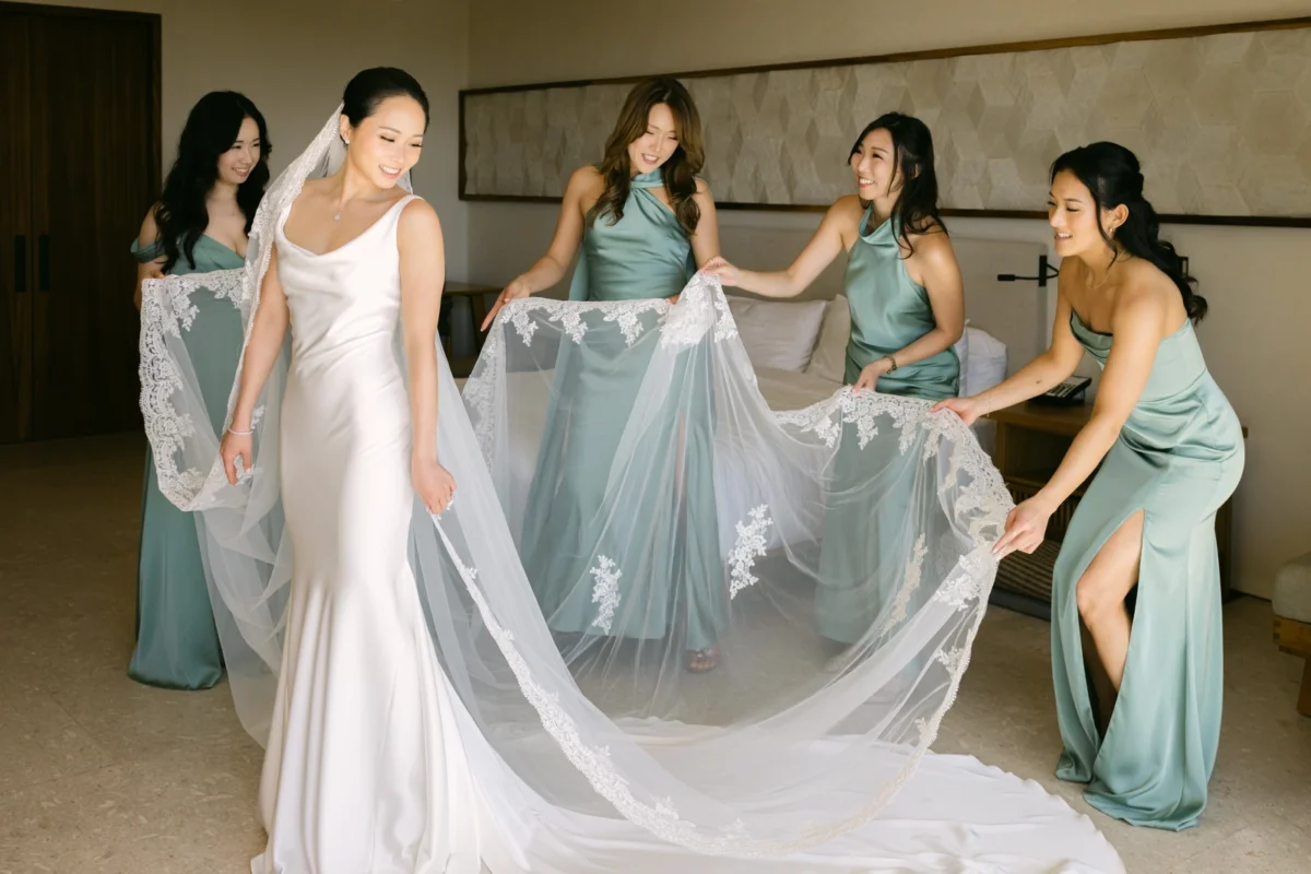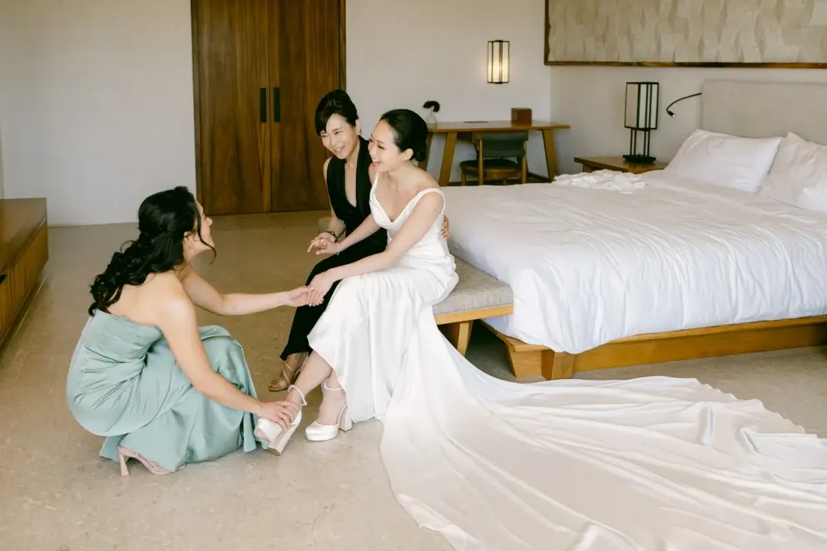 The day began in an upgraded suite flooded with natural light, the perfect canvas for Clare’s beauty team to work their magic. Joined by her five bridesmaids, her mom, and her grandmother (who surprised everyone by making the journey to Cabo), the room was filled with warmth, laughter, and the quiet hum of anticipation. Mimosas flowed, joyful memories were shared, and as Clare stepped into her gown with the help of her mom and sister, it was clear the day was unfolding with heart and harmony.