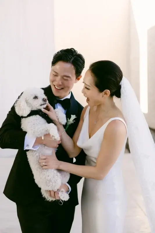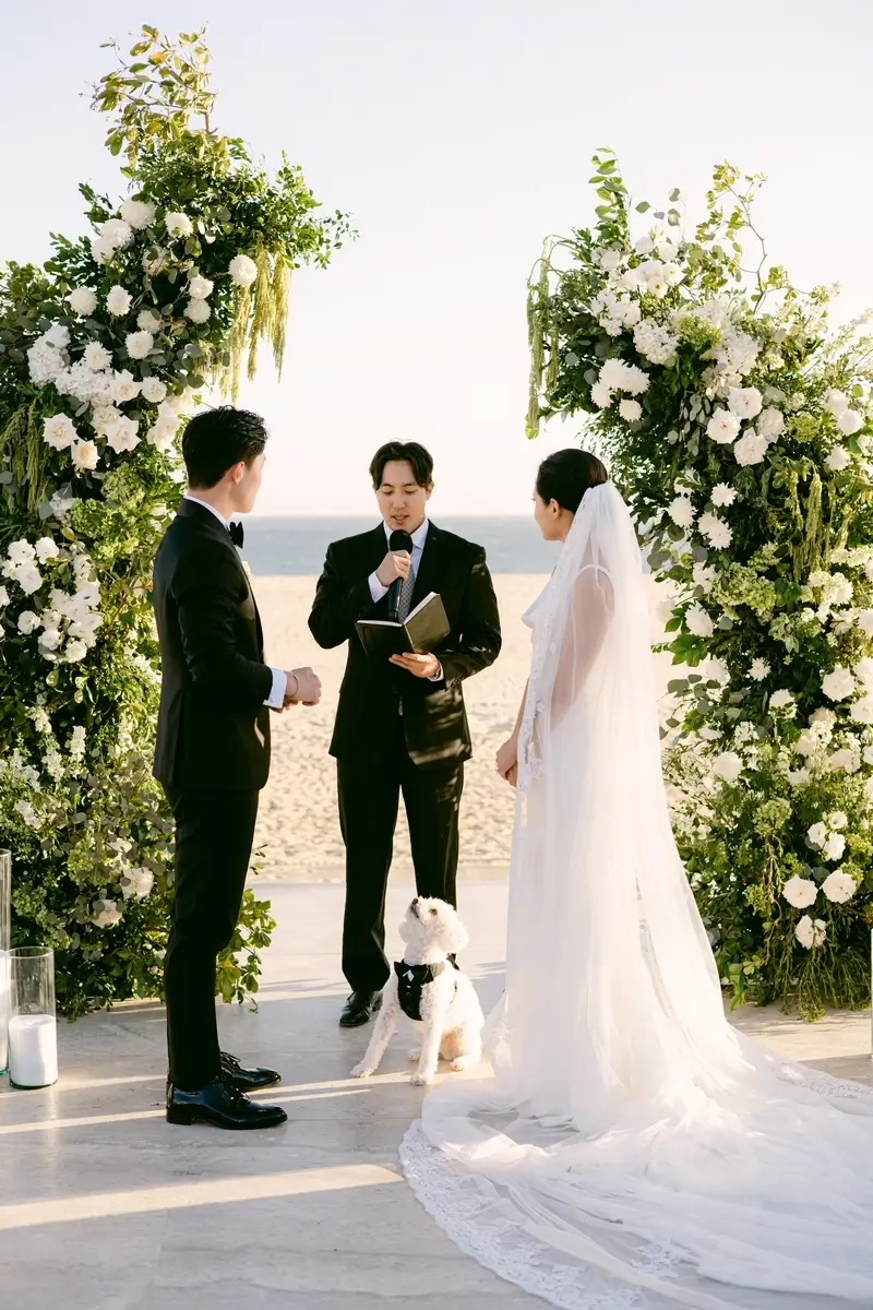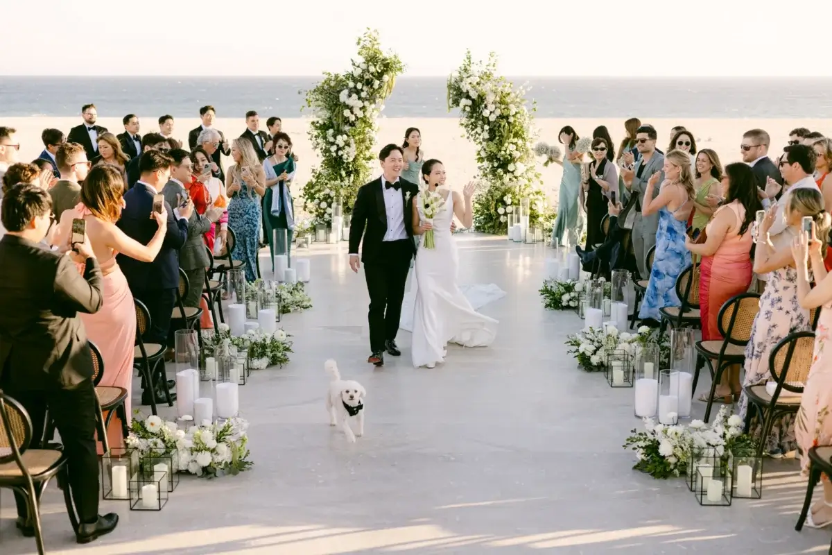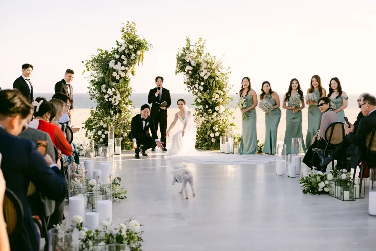 Surrounded by their closest family and friends, the couple said “I do” with the Pacific Ocean as their backdrop and their beloved dog Bently as their honorary ring bearer, who not only nailed his moment but also effortlessly charmed every guest in attendance.
