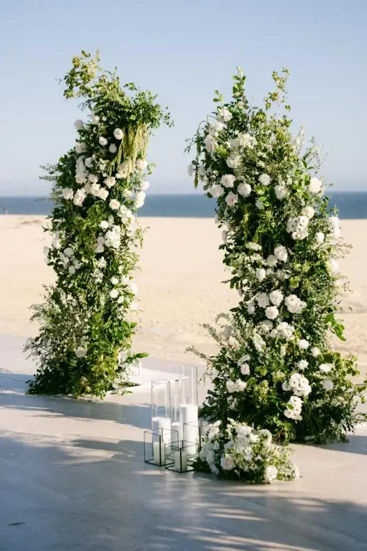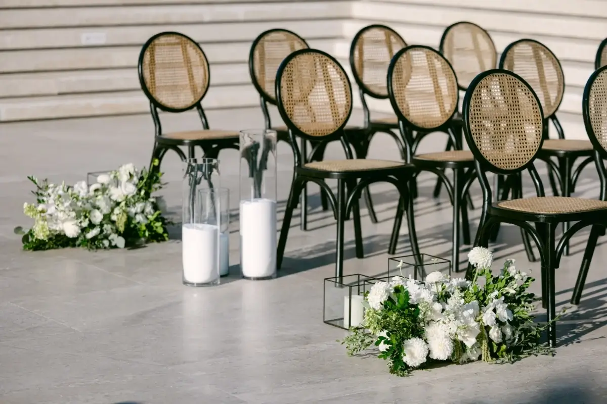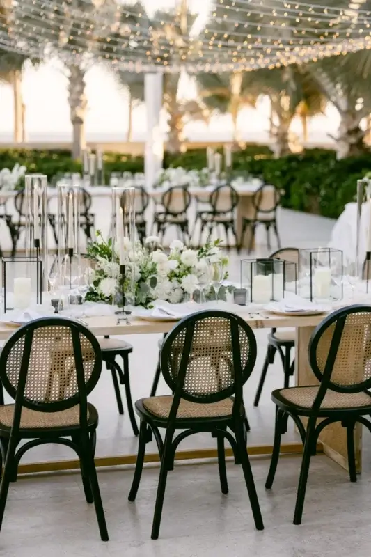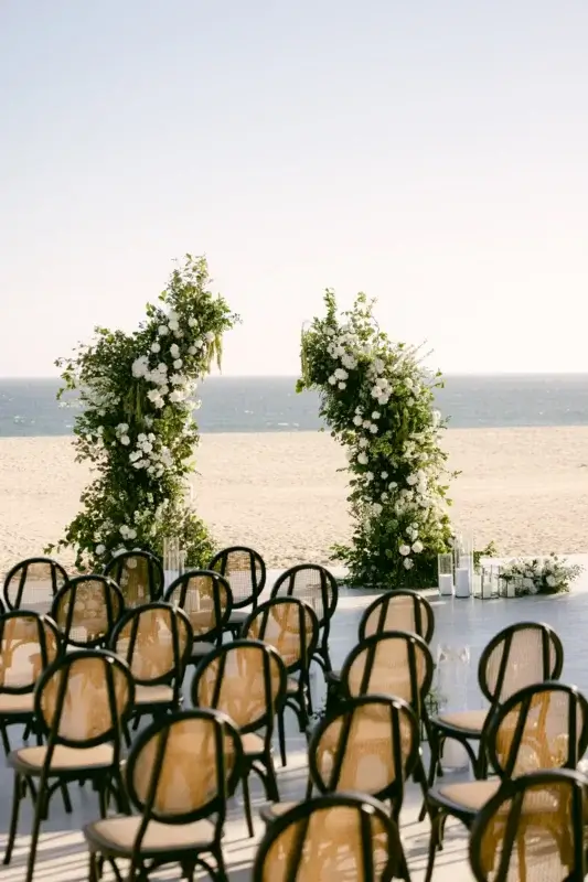 Set on Nobu’s expansive oceanfront terrace, the ceremony space was designed with timeless beauty in mind. Lush white blooms and natural greenery cascaded from a contemporary structure, while a curated aisle of tall glass cylinders, black lanterns, and delicate florals added texture and romance. The wooden chairs with black detailing grounded the look with modern warmth.